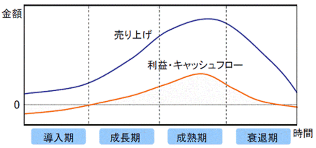 市場参入後の過程を「導入期/成長期/成熟期/衰退期」の4段階で捉え、各段階に応じた最適なマーケティング戦略を策定する必要があります。